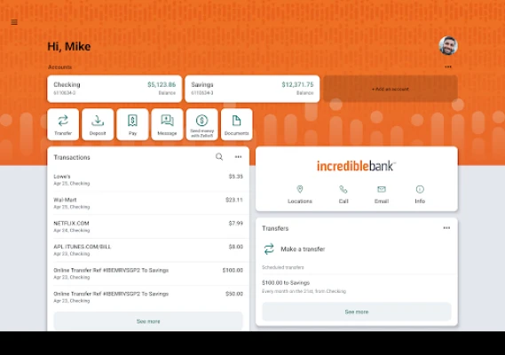 Account management: See account balances, transfer money between your Incredible Bank accounts and view your transaction history.